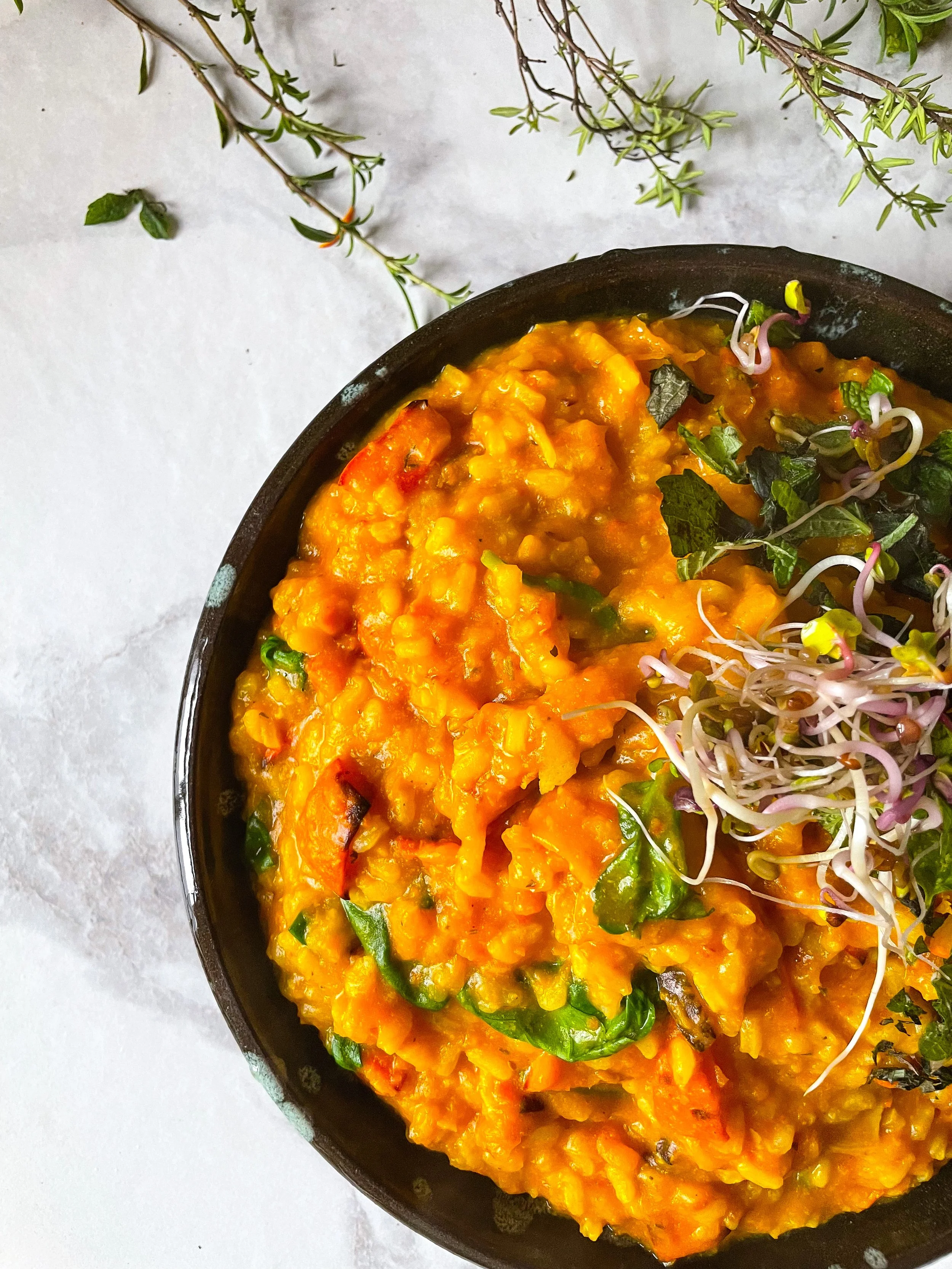 Heute gibts mal wieder ein Rezept - eins meiner liebsten zurzeit. Kürbis ist ja sowieso mein Favorit im Herbst und Winter, aber in diesem Risotto mag ich ihn besonders gern. Risotto ist eben richtiges Comfortfood: Cremig und innerlich wärmend. Und obwohl kein Käse drin ist, wird es dank ein paar Tricks richtig Umami und irgendwie halt doch „käsig“. Ich mag es jedenfalls sehr.