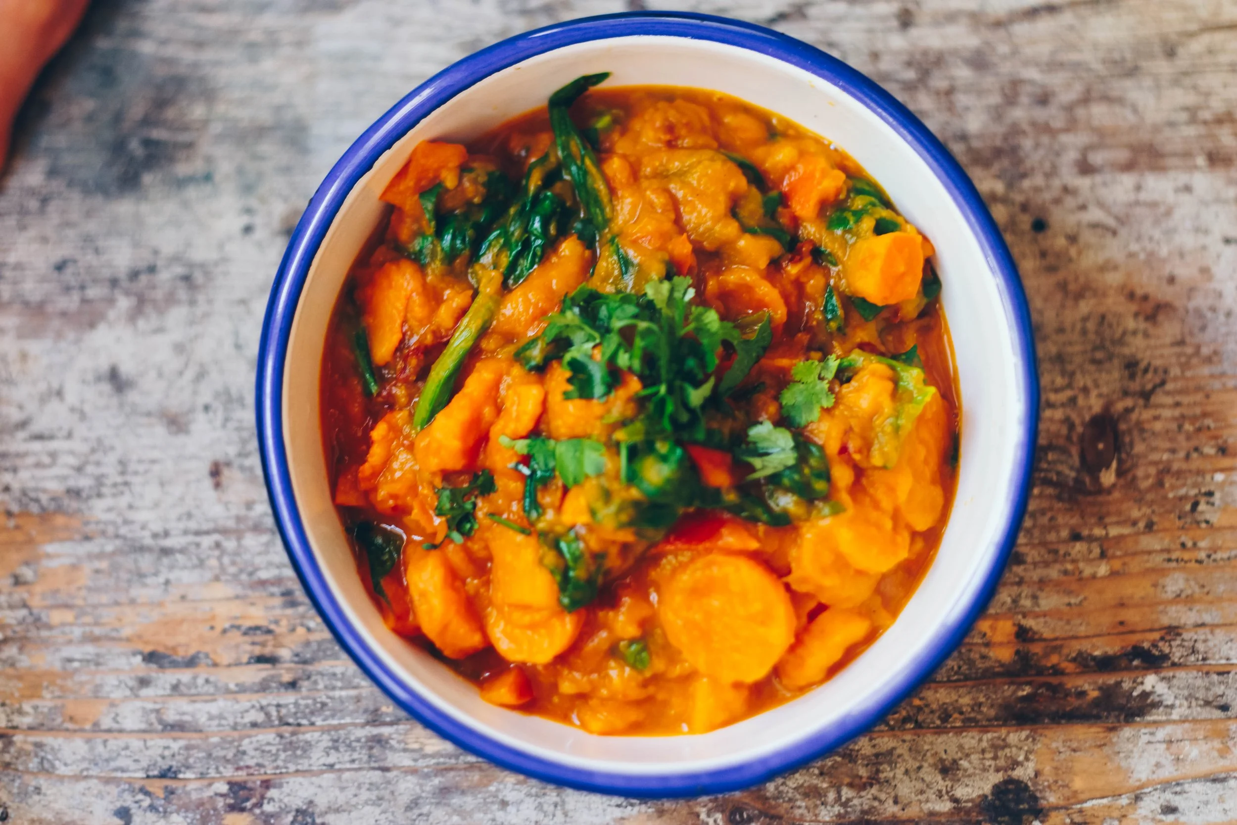 Bring das Kokosöl zum Schmelzen und röste alle Gewürze (bis auf Salz) bei mittlerer Hitze, bis sie anfangen zu duften. Sei vorsichtig, sie verbrennen relativ schnell. Dann gib Kürbis, Möhren und Tomaten dazu und röste sie ein paar Minuten. Jetzt kannst du das Gemüse auch salzen. Wenn du möchtest, kannst du auch ein Korianderstiele dazu geben, auch das schmeckt sehr gut. Gib Wasser dazu, sodass das Gemüse gerade so bedeckt ist und lass es kochen, bis der Kürbis weich ist und anfängt zu zerfallen. Dann gib die Kokosmilch dazu und lass das Curry weiter köcheln. Ich mag das Curry sehr dickflüssig, du kannst aber auch etwas mehr Wasser dazu geben. Entferne das Lorbeerblatt und die Zimtrinde. Gib als letztes Zitronensaft in die Suppe (am besten danach nicht mehr kochen).